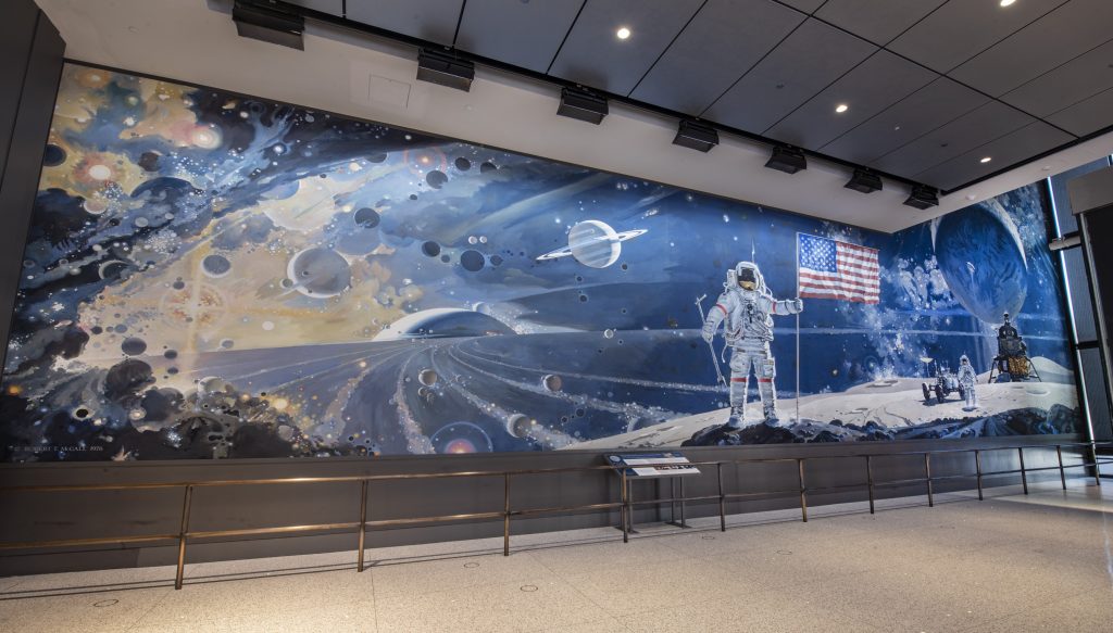 Tate’s scope of work on the NASM project included a custom cladding system for an escalator tunnel located in the museum’s gift shop. The escalator tunnel spans 2 floors and is fitted with 44 custom stainless-steel rib assemblies. The entrance of the escalator tunnel is comprised of multiple 4′ by 8′ stainless steel wall panels. Each panel custom fitted and wrapped around the tunnel with hairline joints. Inside the tunnel, the walls and the ceiling are wrapped with stainless steel rib assemblies.