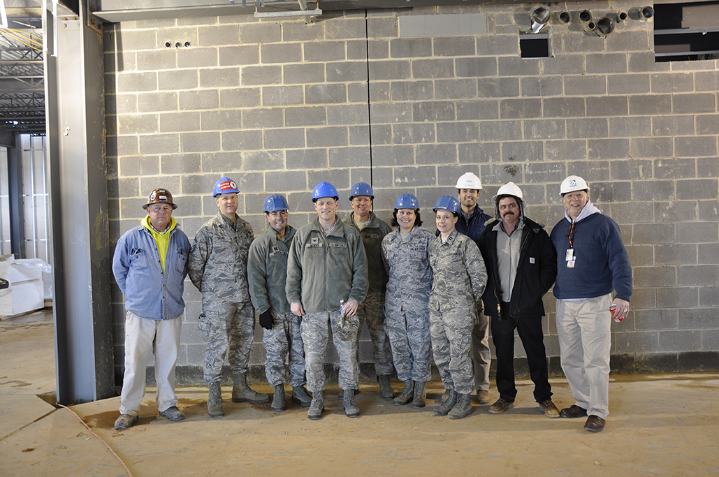 Col. Steven H. Benden, Mission Support Group Commander (center) and several of buildings the new occupants pose for a group photo after a short tour of the new 175th Wing Headquarters, Mission Support Group and Medical Group facility at Warfield Air National Guard Base, Baltimore, Md. This 26,000 square foot, $11.8 million building will feature multiple green roofs and is anticipated to achieve certified LEED Silver status with the numerous energy enhancement measures upon its completion. The building will house offices, medical/dental examination and treatment space, classrooms, administration space, command section, conference rooms, telephone switching/data automation center as well as utility systems services and connections.