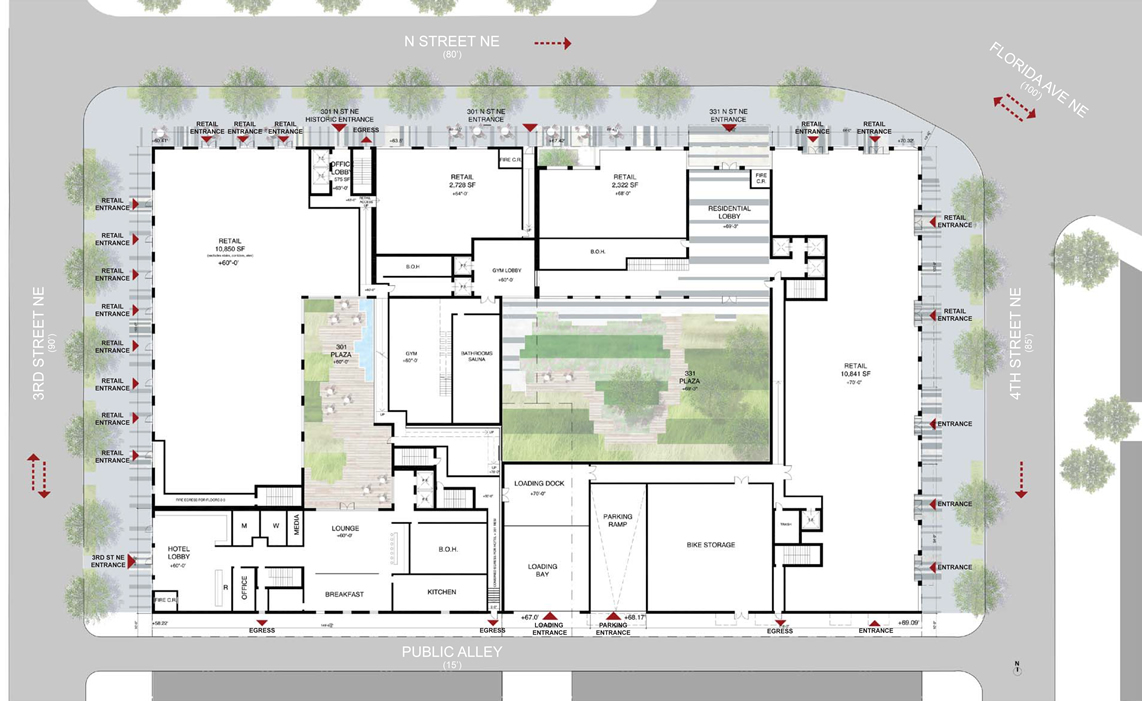 The 301-331 N Street site is located at the epicenter of several successful, high-density, amenity-rich neighborhoods, including Union Market, NOMA, Shaw, and the H Street corridor. The area is further bolstered with cohesive retail options, such as the flagship REI store located at the nearby Uline Arena development. These established districts have proven to be some of the strongest new retail centers, which will serve as an attractive amenity base for the 301-331 N Street project. At completion, the site will sit among neighboring developments that will offer a critical mass of over 200,000 SF of retail at build-out, creating a vibrant street environment. The application states, “The Project will create a truly transit-oriented urban mixed-used community that will add new housing, retail, offices, and a hotel to an exciting and transforming neighborhood.”