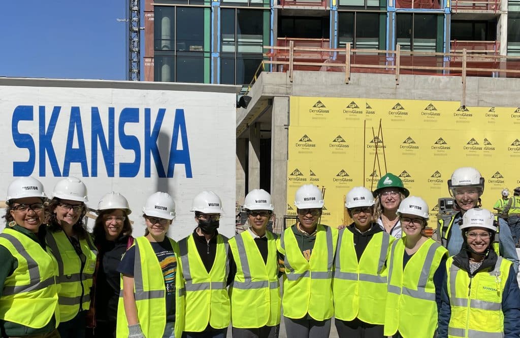 Members of Skanska’s team in the Washington, DC region volunteer with ACE, a free, award-winning, afterschool program designed to attract high school students into pursuing careers in the architecture, construction and engineering industries, including skilled trades. Mahan and Briceno showed the Georgetown Visitation students the various stages of construction currently underway at OZMA and talked to them about the myriad of careers that are available for women in the construction industry.