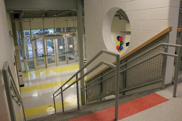 The new school features a flexible room that serves as auditorium with raised stage, indoor gymnasium and cafeteria; additionally, there are choral and instrumental music rooms, visual arts and dance facilities, classrooms equipped with SMART boards, and administrative offices. The split level design of the school creates a distinct interior separation between the Pre-K and kindergarten and the older elementary school students.