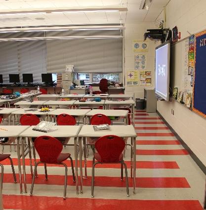 The new school features a flexible room that serves as auditorium with raised stage, indoor gymnasium and cafeteria; additionally, there are choral and instrumental music rooms, visual arts and dance facilities, classrooms equipped with SMART boards, and administrative offices. The split level design of the school creates a distinct interior separation between the Pre-K and kindergarten and the older elementary school students.