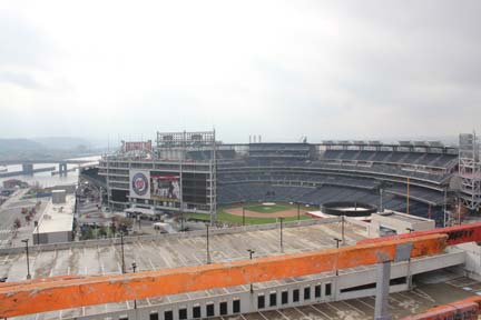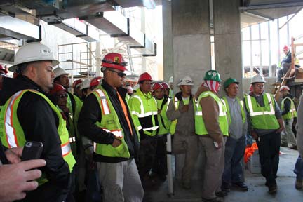 Pictures (left to right): View from the rooftop overlooking Nationals Park and Potomac River; Workers listening to SIGAL’s Project Manager Chris Muldowney speaking about the progress of the project.