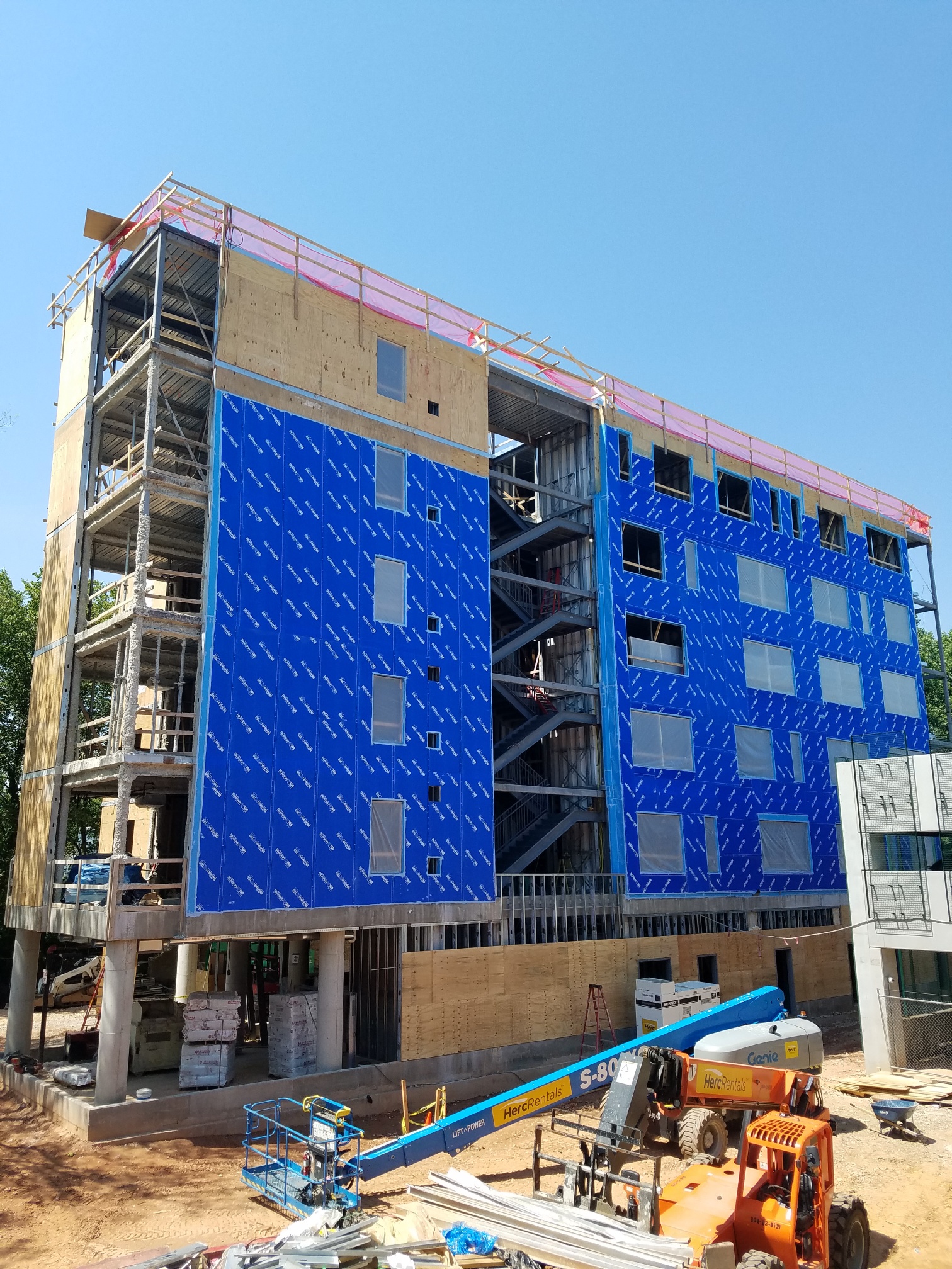 The Ward 3 Short Term Family Housing project is a new six-story, 45,000 SF housing facility for the Department of Human Services that will provide short term family housing for families coming out of homelessness. The structure consists of a 1 story conventional concrete podium, with 5 stories of a composite structural slab supported with prefabricated metal stud bearing walls. The façade includes Brick, Terracotta, Storefront, Curtainwall, Punch windows and metal panels. In addition to the 50 “dorm style” sleeping units, abundant indoor and outdoor community gathering spaces are provided including dining, kitchen and multipurpose spaces, study rooms, health/exam spaces, playground and outdoor assembly spaces, office and meeting spaces, as well as wrap-around services to assist families in finding permanent housing and employment. The project is targeting LEED gold certification, with green features that include green roof, bioretention rain garden, and features for enhanced indoor environmental quality. In order to accommodate the housing and community facility on the tight urban site adjacent to an existing police station, the project also included a 3-level precast parking garage with 240 spaces for officer parking. Construction is on schedule for completion December 2019.